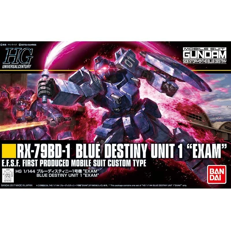 Gundam Universal Century Gundam Blue Destiny Unit 1 « Exam » dans la gamme HG par Bandai.Gunpla maquette du robot Blue Destiny Unit 1 « Exam » High Grade 1/144 avec de nombreux accessoires pour varier les poses.