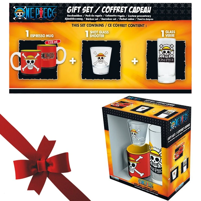 One Piece Coffret Cadeau Etendard de Luffy. Offrez ce magnifique set One Piece composé d’un verre, d’une tasse et d’un verre à shooter aux couleurs de Luffy.